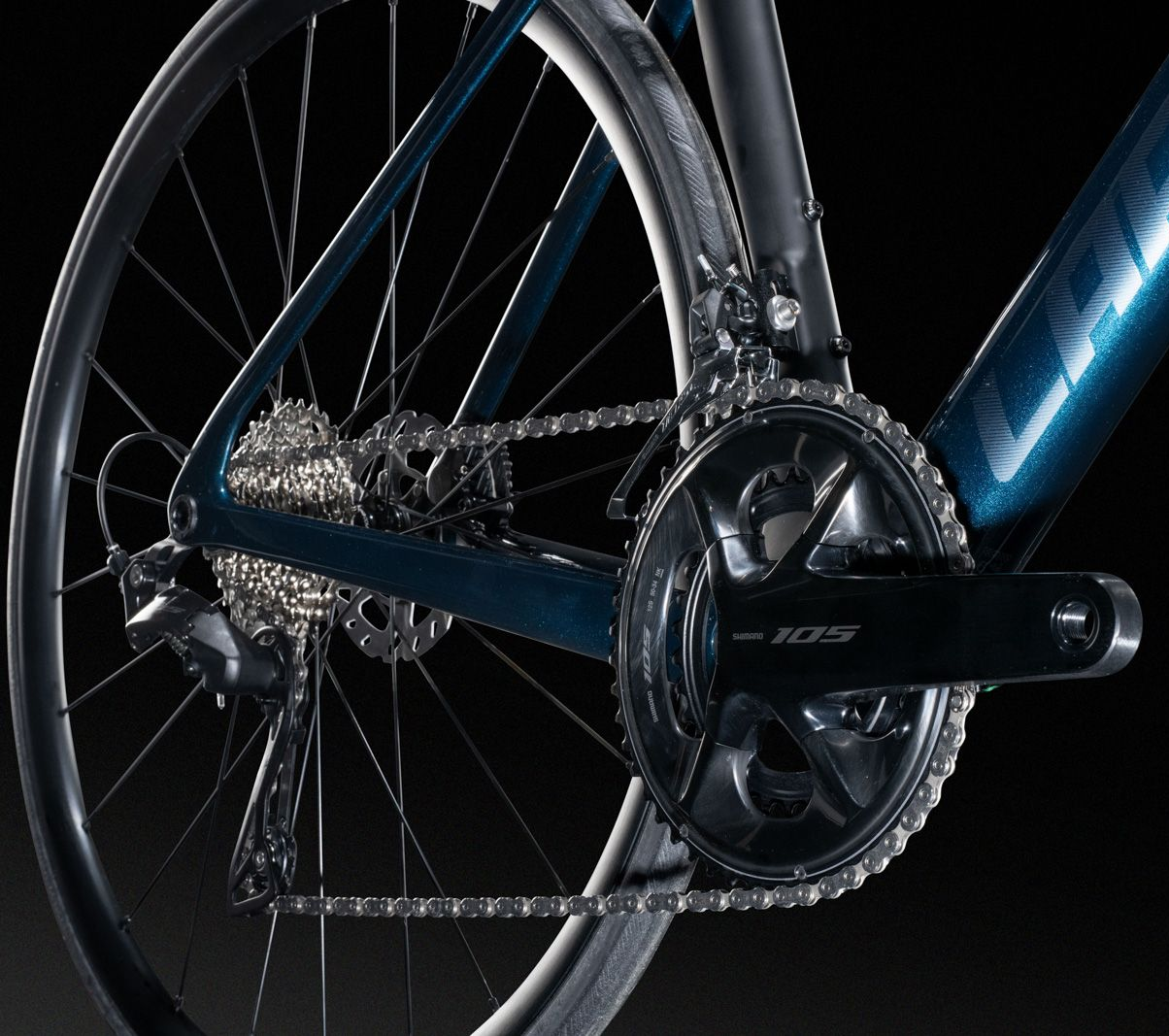 Por otro lado, su sistema de transmisión Shimano 105 R7100, con una configuración de 24 velocidades y un cassette 11-34T, te permitirá contar con un versátil rango de marchas. Esta configuración permitirá tanto alcanzar altas velocidades en terrenos planos como enfrentar pendientes muy desafiantes sin que tengas que sacrificar eficiencia. El plato doble con dientes de 50-34T es perfecto si lo que buscas es velocidad y potencia en cada uno de los pedaleos que des.